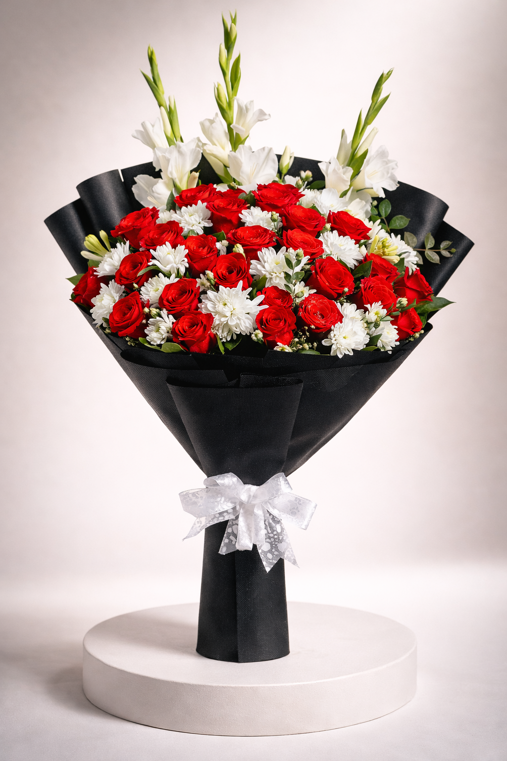 Our most comprehensive arrangement yet, the “Elite Velvet & Snow” combines three of Lahore’s favorite blooms into one lush masterpiece. The deep passion of red roses meets the purity of white chrysanthemums and the stature of white gladiolus. Finished in a premium black wrap with a delicate white lace ribbon, this bouquet is designed for those who want to provide a truly “full” and luxurious floral experience.
