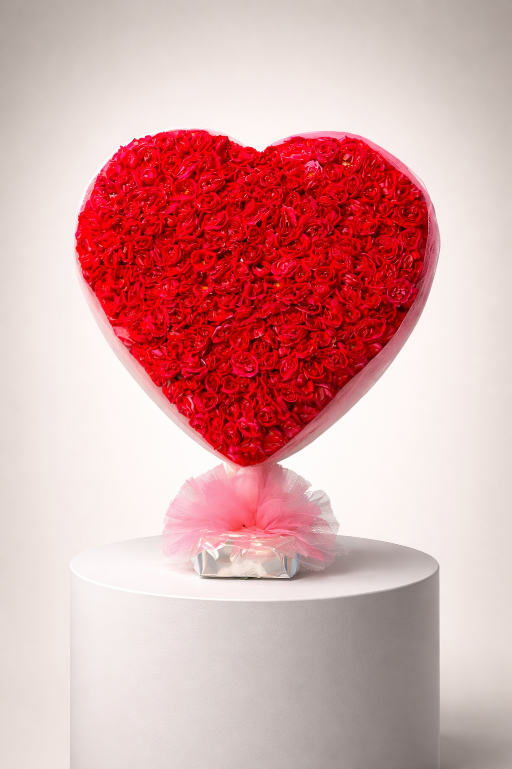 A breathtaking masterpiece of floral engineering, this arrangement is the ultimate declaration of devotion. Hundreds of premium, velvety red roses are meticulously hand-placed to create a flawless, grand-scale heart silhouette. This show-stopping design is encased in a soft, ethereal pink mesh border and stands atop a weighted base accented with a delicate tulle bow. It is designed specifically for those moments where words are not enough—proposals, milestone anniversaries, or an unforgettable Valentine’s surprise. Every rose is chosen for its structural integrity and deep, consistent color to ensure a majestic presentation from every angle.