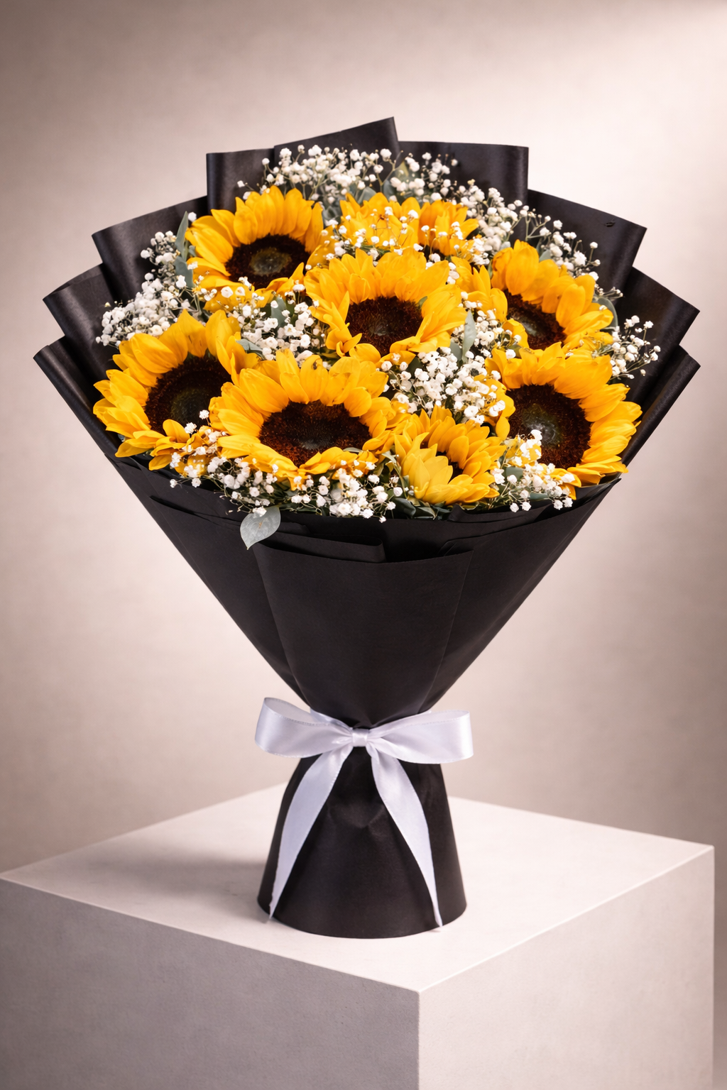 Floral Mix: Premium Imported Sunflowers, White Baby’s Breath, Ivory Mums.