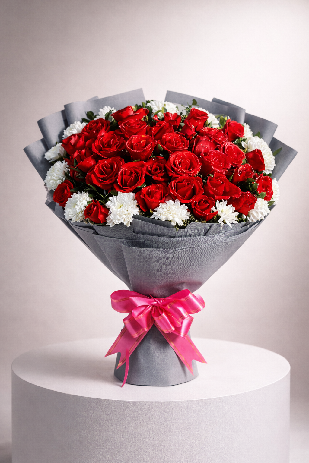 Redefine modern luxury with a floral arrangement that balances bold passion with contemporary minimalism. This striking dome features a dense core of premium red roses, expertly accented with crisp white chrysanthemums that peek through the velvety petals like fresh snow. The arrangement is showcased in a unique, professional slate-grey artisan wrap, offering a sophisticated alternative to traditional colors. Finished with a vibrant magenta satin bow, this high-volume bouquet is designed for those who appreciate avant-garde floral styling. It is a stunning choice for luxury corporate gifting, upscale anniversaries, or a high-fashion Valentine’s gesture.